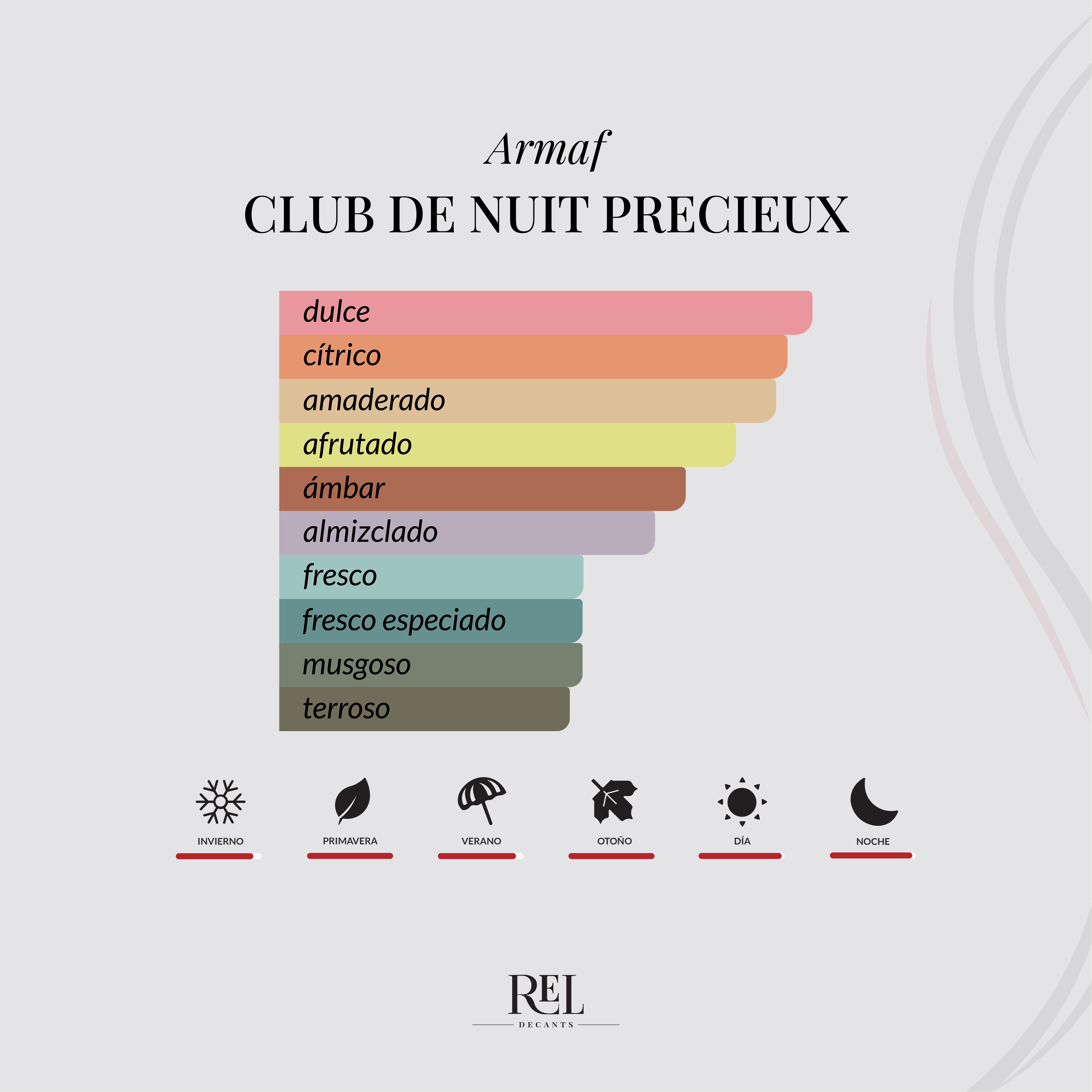 Club de Nuit Précieux de Armaf es una fragancia ámbar amaderada unisex, lanzada en 2024, que destaca por su perfil elegante, moderno y sofisticado. Es una versión más refinada dentro de la línea Club de Nuit, con un aroma frutal oscuro y lujoso, ideal para quienes buscan un perfume llamativo pero bien trabajado.