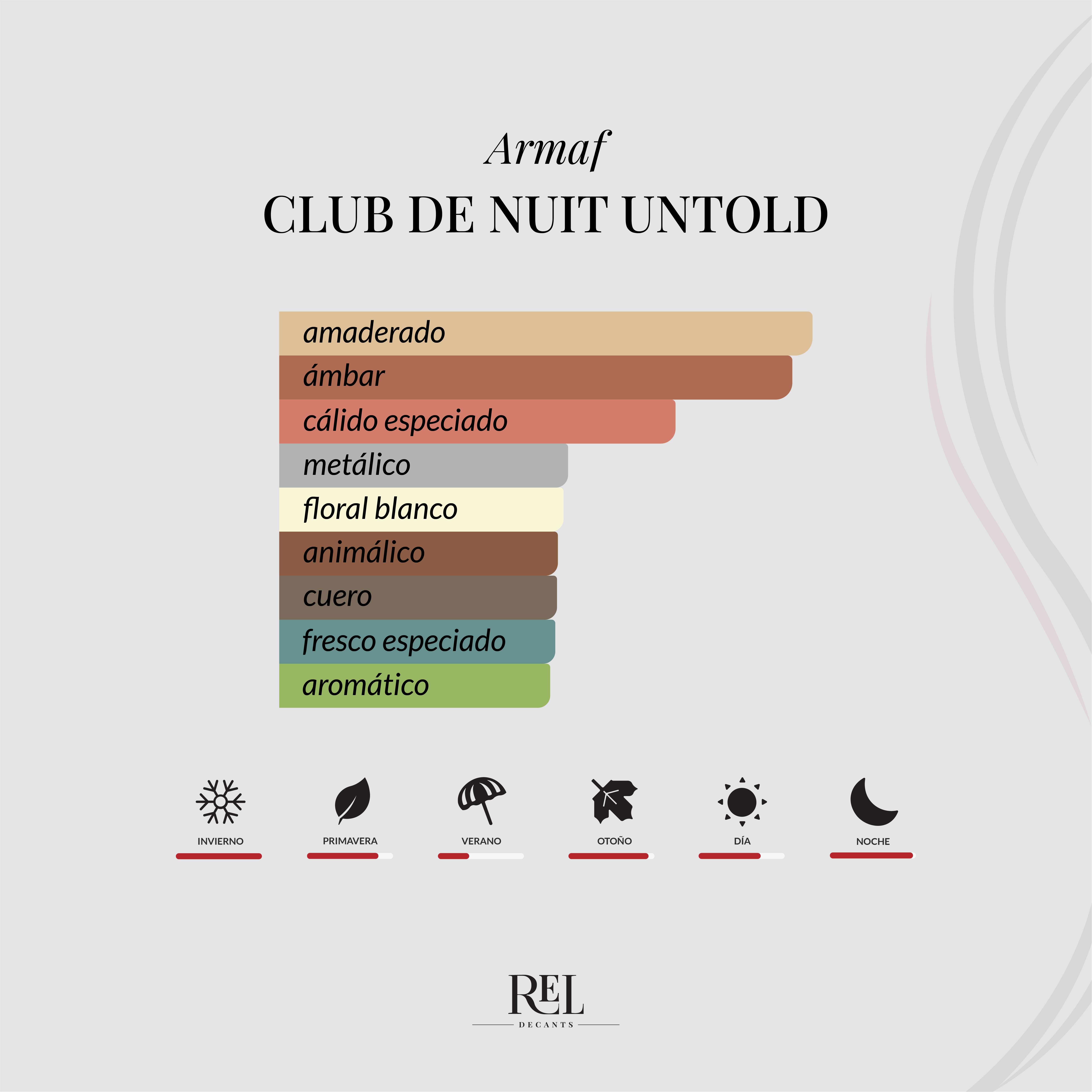 Club de Nuit Untold de Armaf es una fragancia ámbar floral unisex, lanzada en 2022, que destaca por su perfil dulce, cálido y muy envolvente, con una vibra elegante, moderna y extremadamente seductora. Es un perfume muy reconocido por su estilo tipo lujo y su gran capacidad de dejar huella.