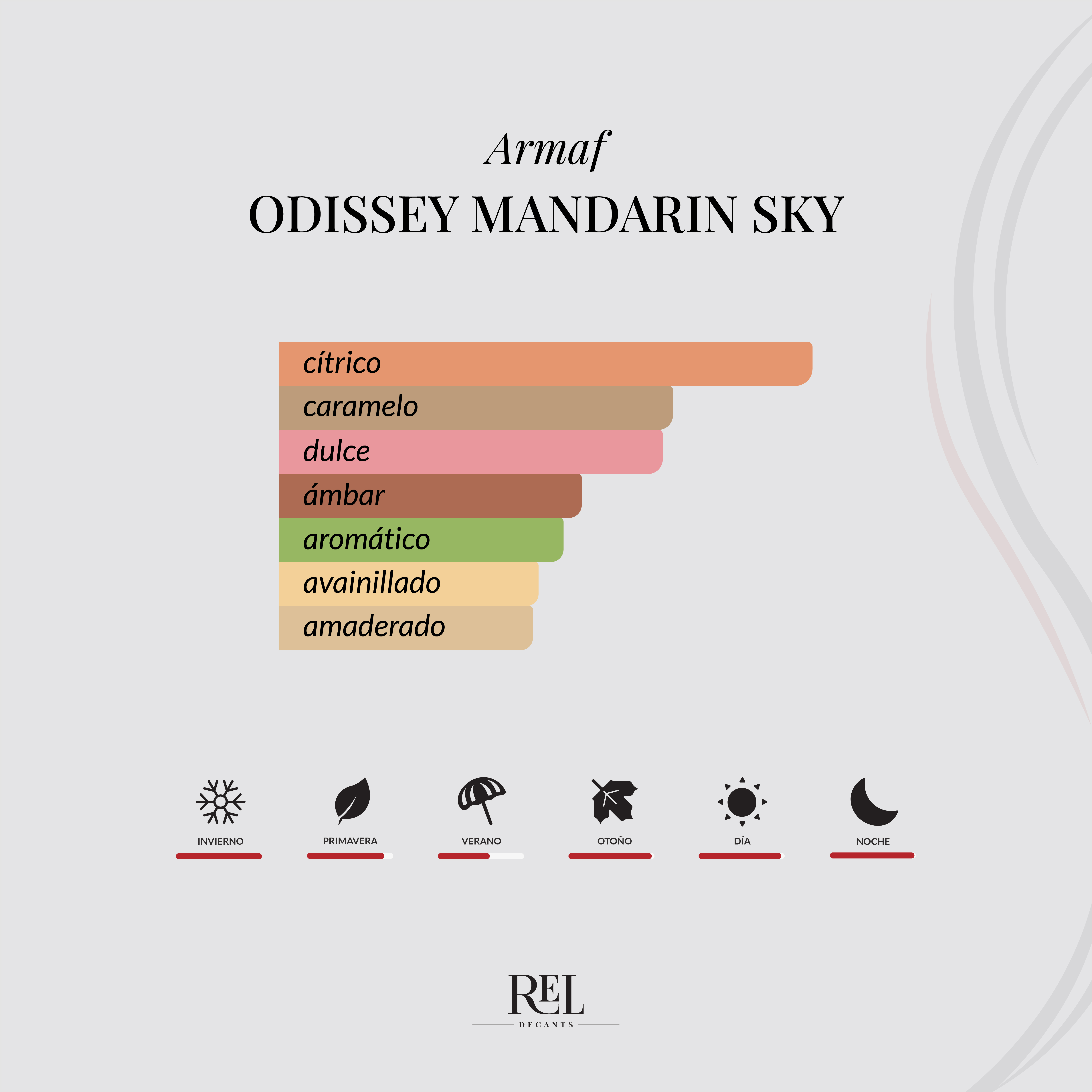 Odyssey Mandarin Sky de Armaf es una fragancia ámbar gourmand masculina, lanzada en 2023, que destaca por su perfil dulce, cítrico y muy adictivo, con una vibra moderna y seductora. Es un perfume que mezcla frescura vibrante con un fondo cálido tipo caramelo, logrando un aroma llamativo y versátil.