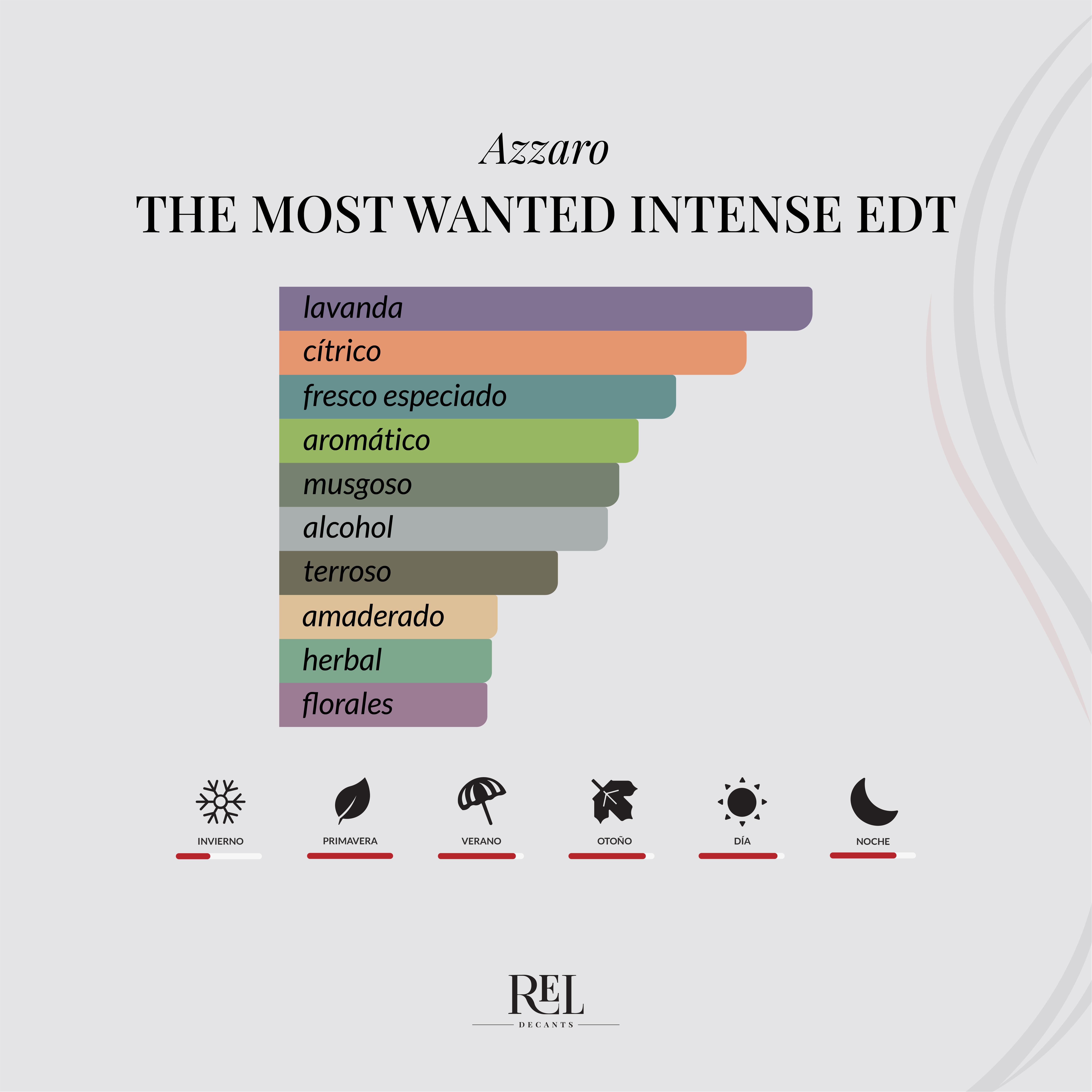 The Most Wanted EDT Intense de Azzaro es una fragancia aromática fougère ambarada masculina, lanzada en 2024, que destaca por su perfil fresco, dulce y moderno, con una vibra seductora pero más versátil que otras versiones de la línea. Es una opción ideal para quienes buscan un perfume equilibrado entre frescura y dulzor.