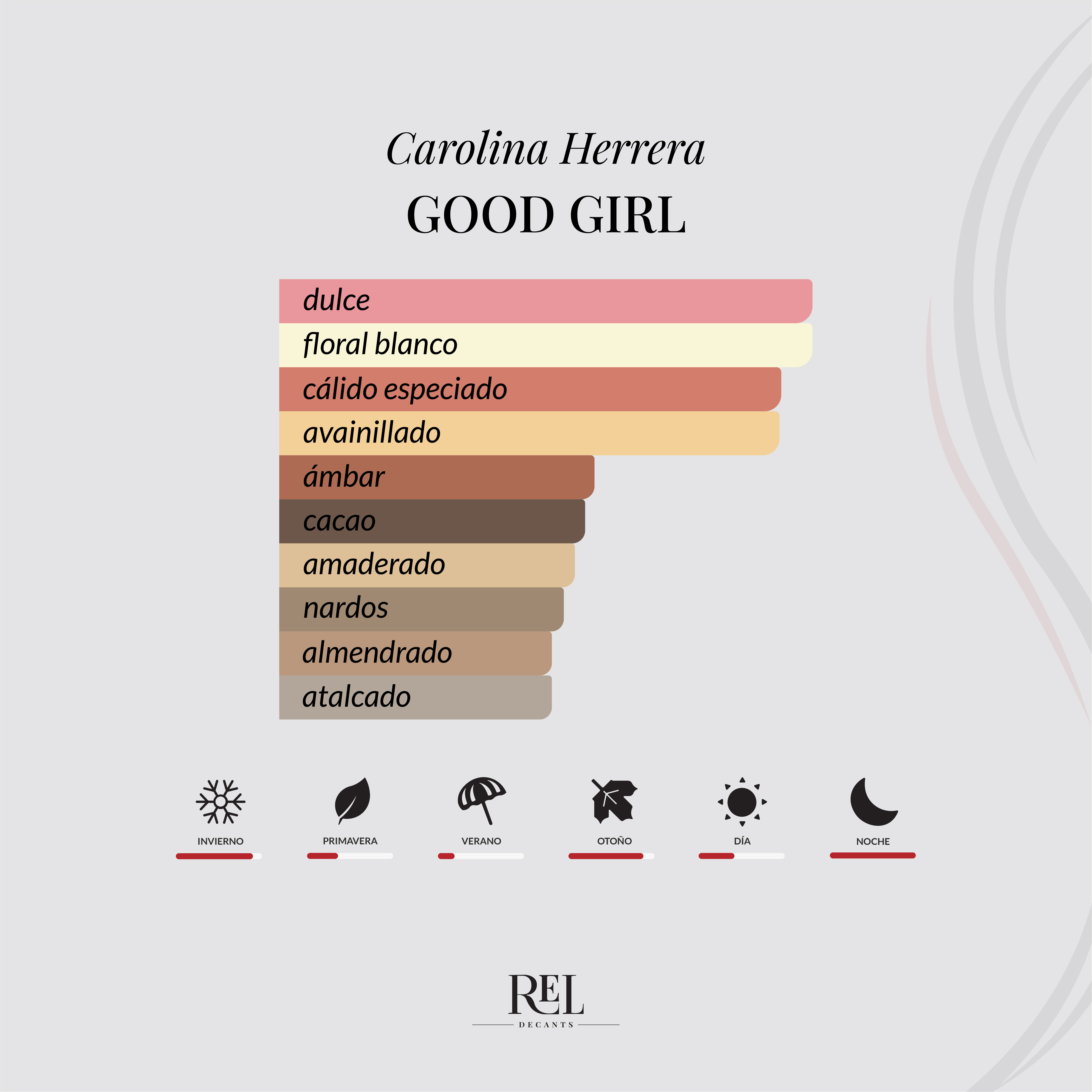Good Girl de Carolina Herrera es una fragancia ámbar floral femenina, lanzada en 2016, que destaca por su perfil dulce, elegante y muy seductor, con una vibra sofisticada y moderna. Es un perfume icónico que representa el contraste entre lo dulce y lo intenso, logrando un aroma poderoso y femenino.