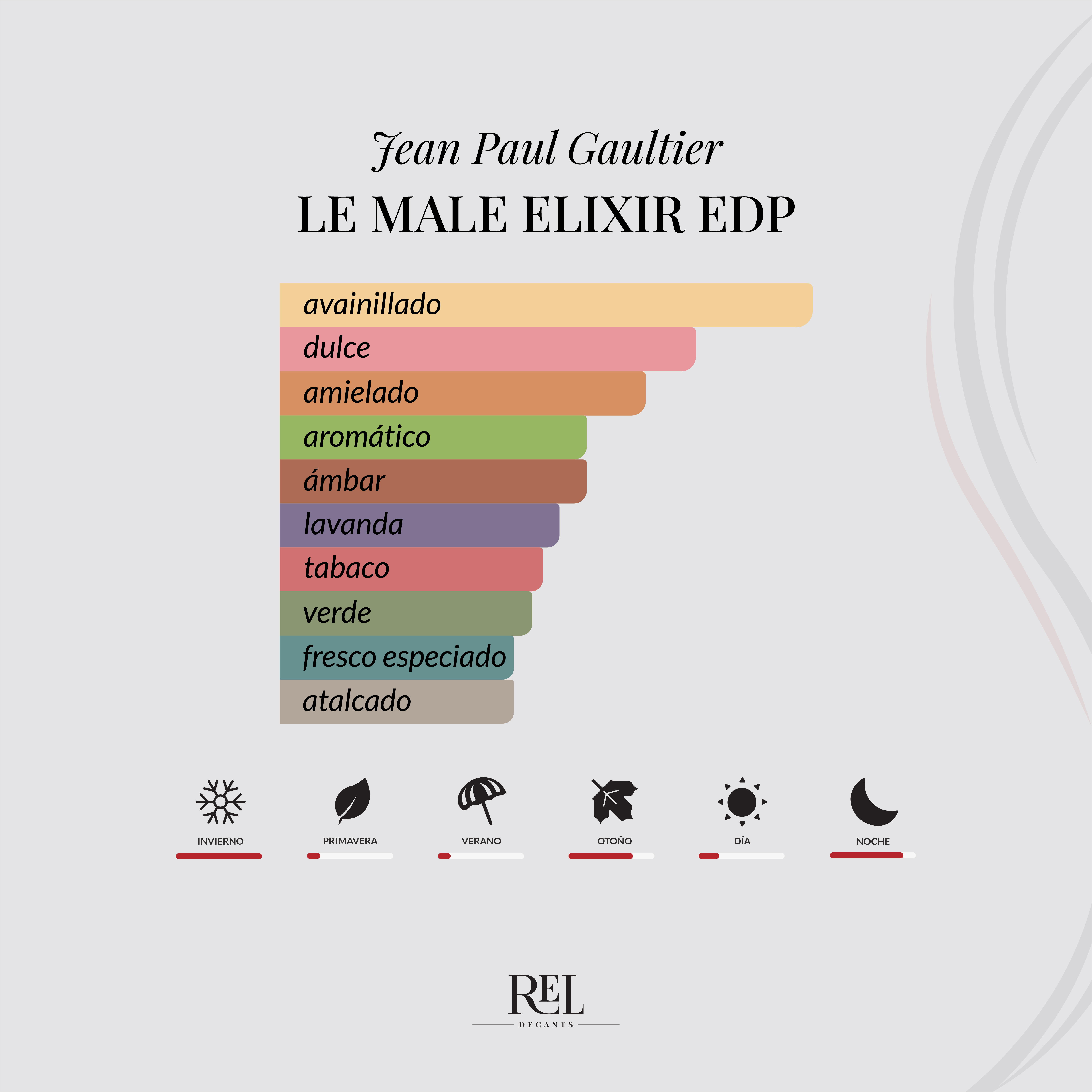 Le Male Elixir EDP de Jean Paul Gaultier es una fragancia ámbar fougère gourmand masculina, lanzada en 2023, que destaca por su perfil dulce, cálido y extremadamente seductor, con una vibra intensa y moderna. Es una de las versiones más potentes de la línea Le Male, pensada para dejar huella.