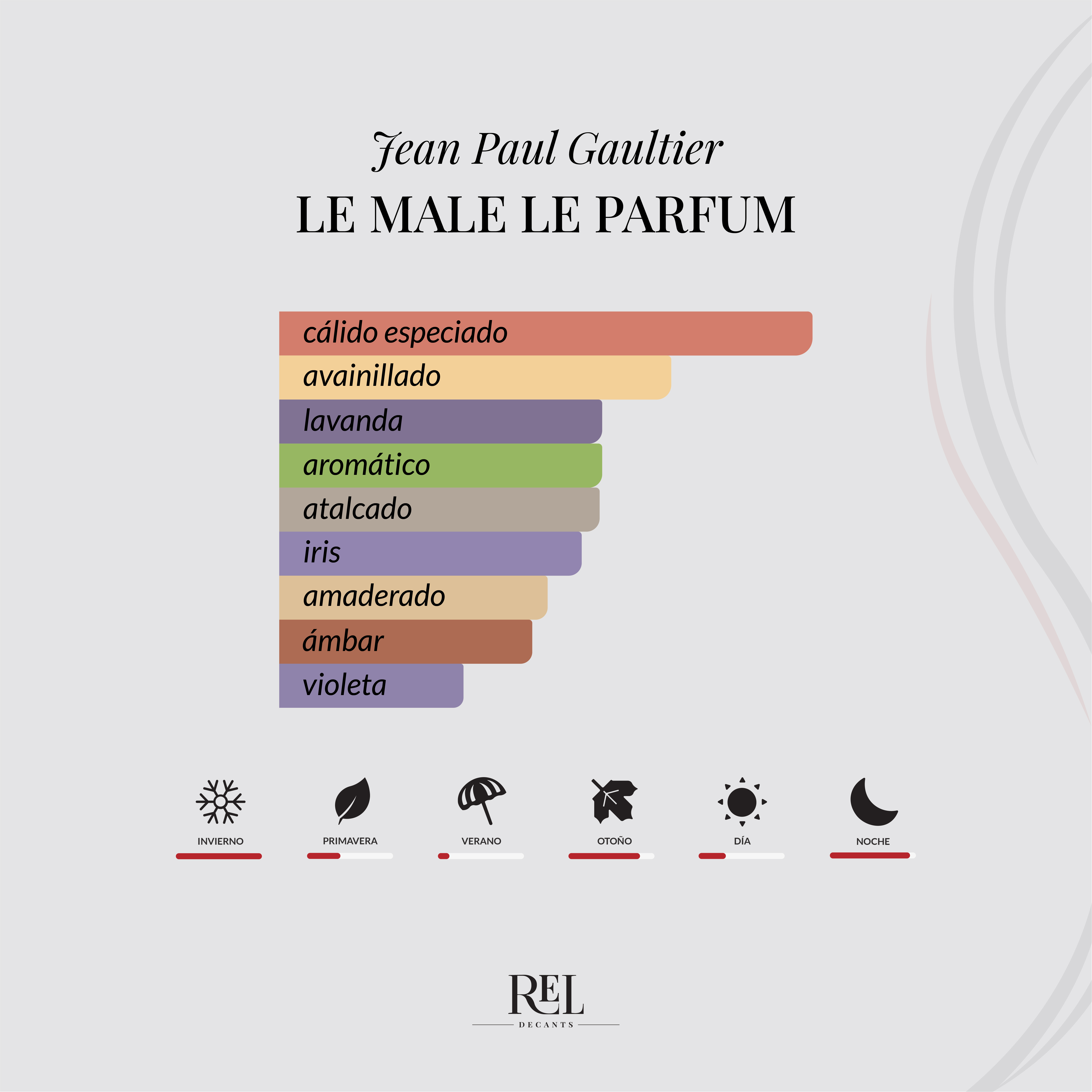 Le Male Le Parfum de Jean Paul Gaultier es una fragancia ámbar amaderada masculina, lanzada en 2020, que destaca por su perfil dulce, especiado y elegante, con una vibra intensa y muy sofisticada. Es una versión más madura y refinada del clásico Le Male, pensada para un estilo moderno y seductor.