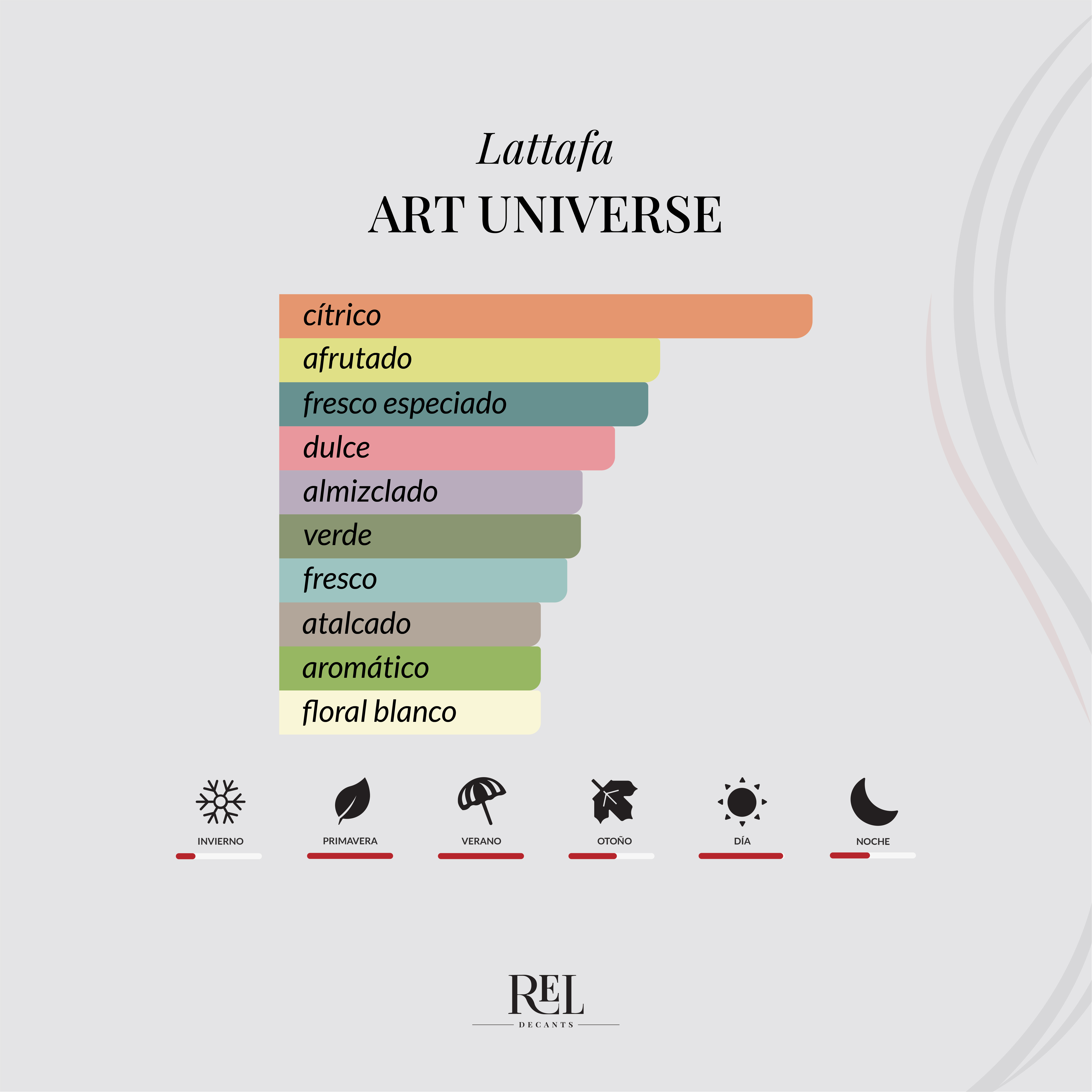 Art Of Universe de Lattafa es una fragancia cítrica aromática unisex, lanzada en 2025, que destaca por su perfil fresco, vibrante y moderno. Es un perfume luminoso y versátil, ideal para quienes buscan un aroma limpio pero con un toque dulce y sofisticado que lo hace diferente.
