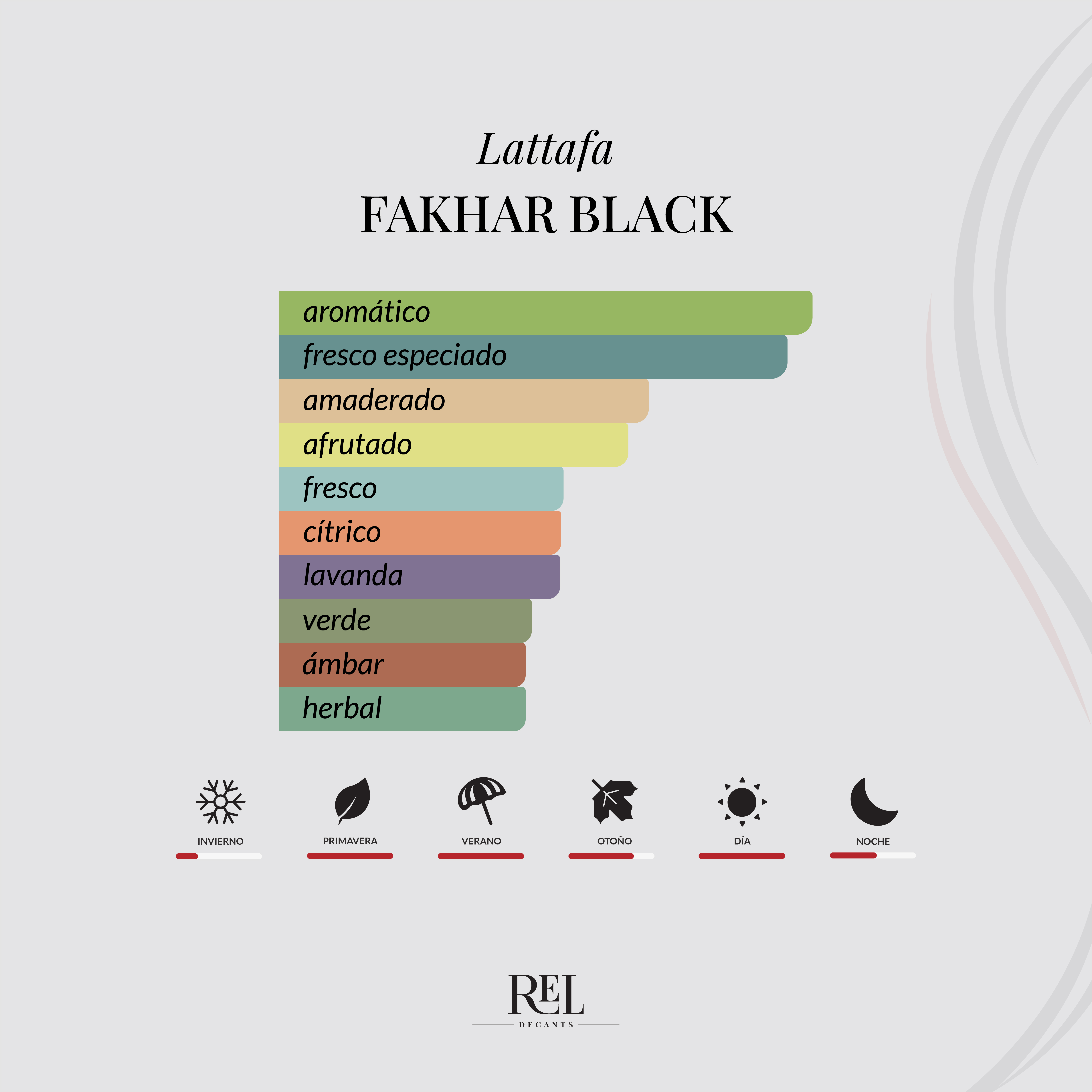 Fakhar Black sigue la línea de perfumes modernos tipo aromático fresco elegante, inspirado en fragancias de diseñador como Y de Yves Saint Laurent, logrando un equilibrio entre frescura, dulzor y elegancia.
