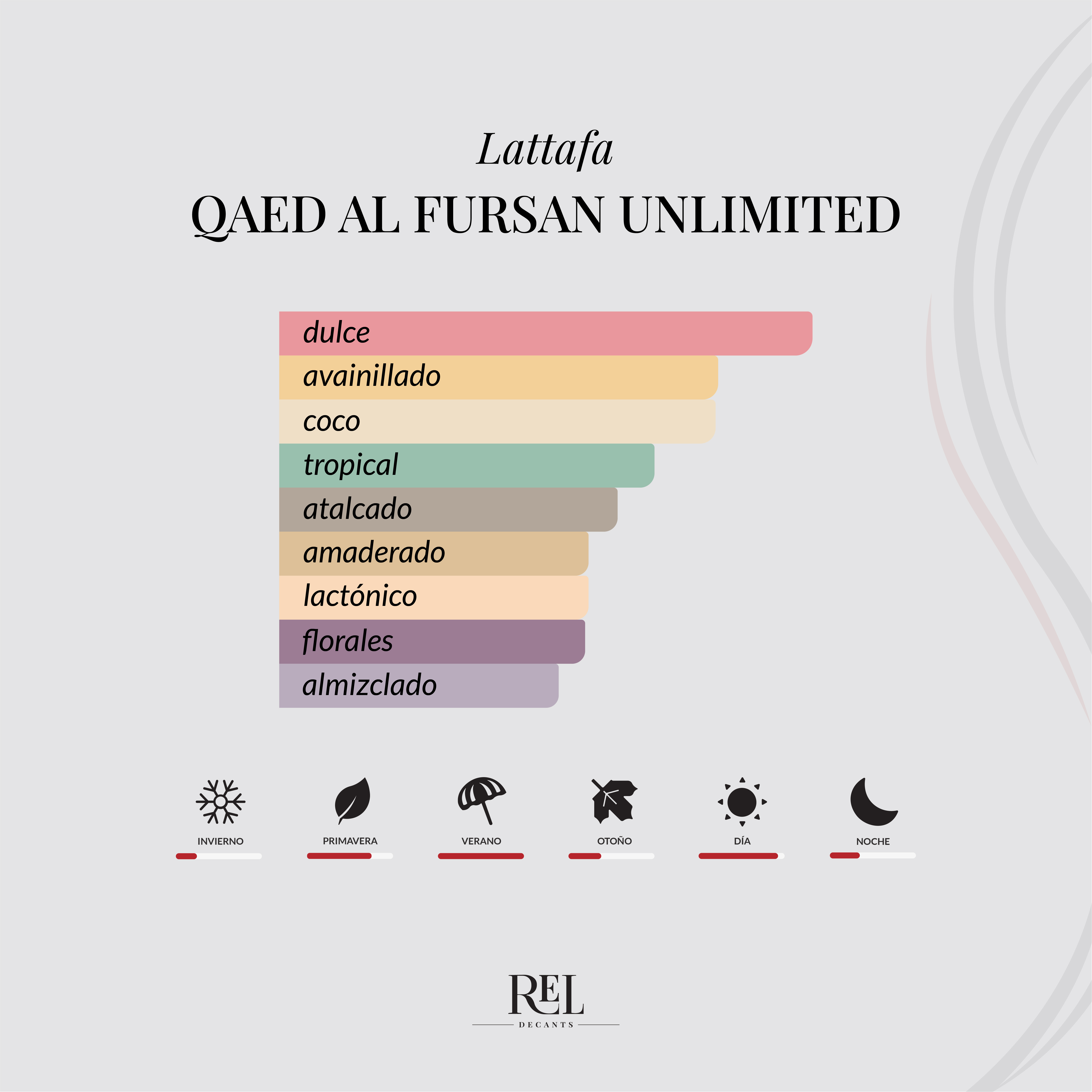 Qaed Al Fursan Unlimited sigue la línea de perfumes tropicales gourmand, con un ADN cremoso, dulce y veraniego, muy en la onda de fragancias tipo playa de alta gama. Es ese estilo “vacaciones en una botella”, pero accesible.