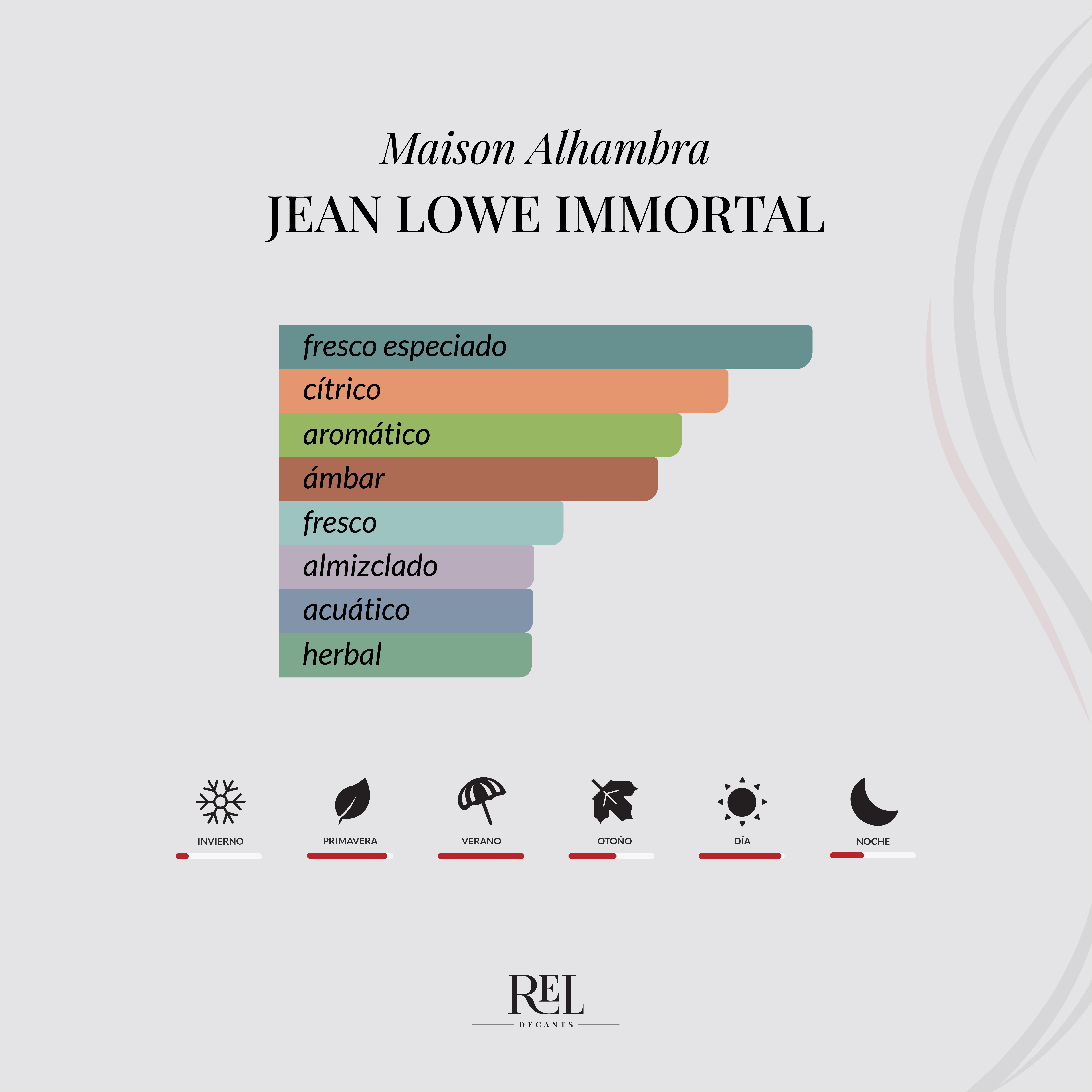 Jean Lowe Immortal de Maison Alhambra es una fragancia ámbar especiada masculina, lanzada en 2023, que destaca por su frescura moderna combinada con un fondo cálido y elegante. Inspirada en L’Immensité de Louis Vuitton, esta creación ofrece un aroma limpio, sofisticado y vibrante, ideal para quienes buscan destacar con un perfil refinado pero versátil.