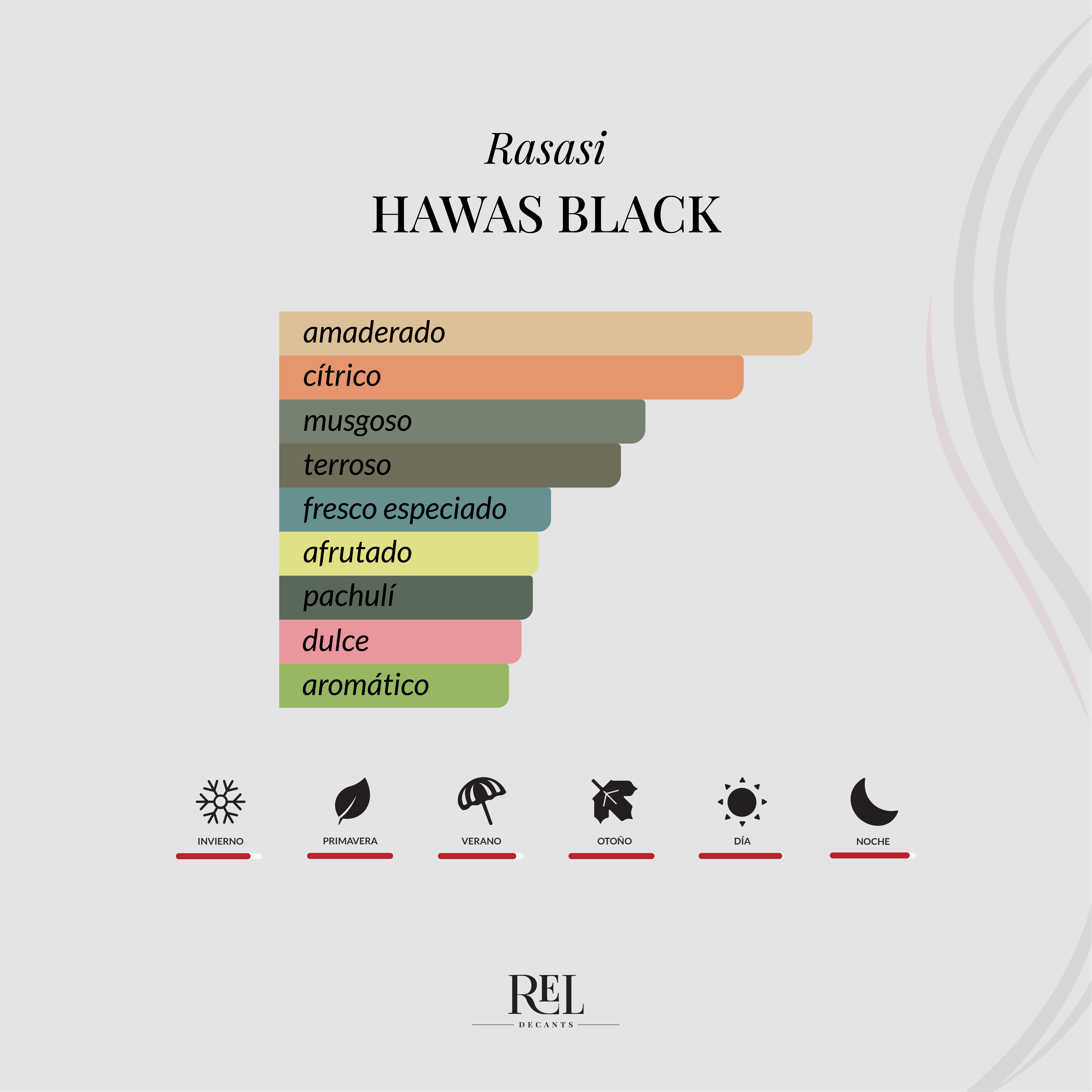 Hawas Black está claramente inspirado en Hacivat de Nishane, ofreciendo una alternativa más accesible con ese ADN frutal, amaderado y elegante, combinando frescura cítrica con un fondo oscuro y sofisticado.