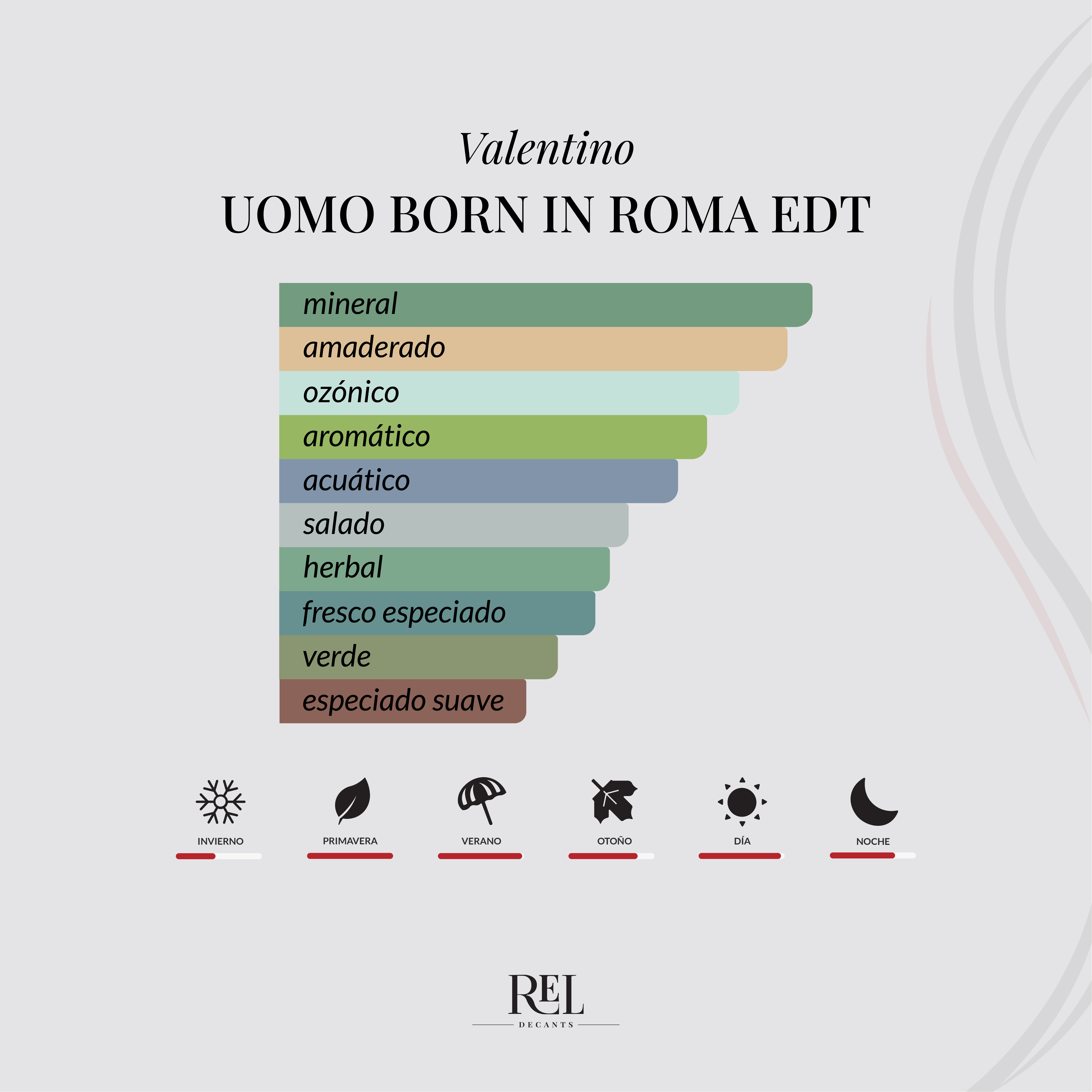 Uomo Born In Roma Eau de Toilette de Valentino es una fragancia amaderada especiada masculina, lanzada en 2019, que destaca por su perfil fresco, moderno y elegante con un toque mineral único. Es un perfume versátil, limpio y sofisticado, ideal para el día a día pero con personalidad.