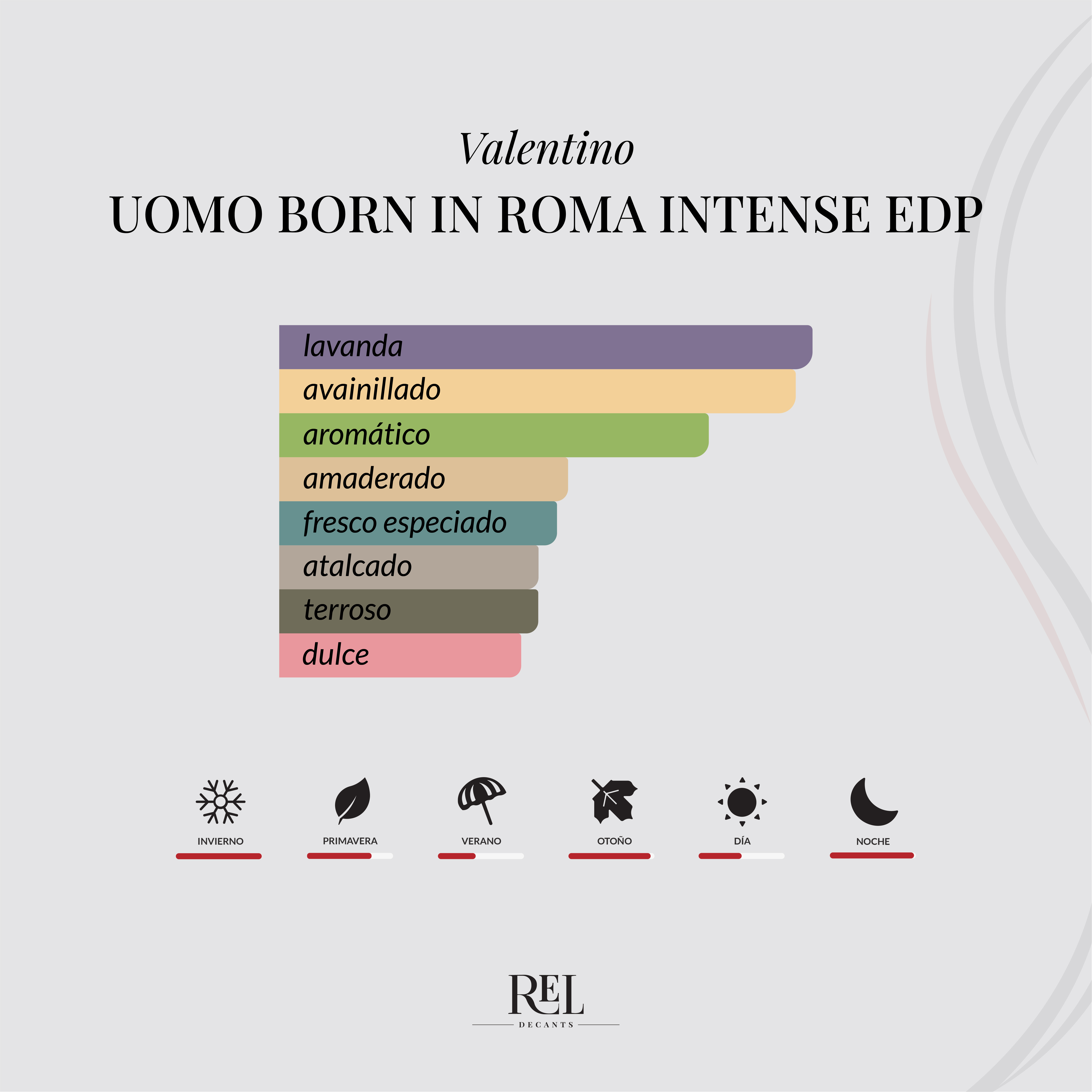 Uomo Born In Roma Intense de Valentino es una fragancia oriental vainilla masculina, lanzada en 2023, que destaca por su perfil dulce, elegante y profundamente seductor. Es una versión más intensa y nocturna del Born In Roma original, pensada para dejar una impresión fuerte y moderna.