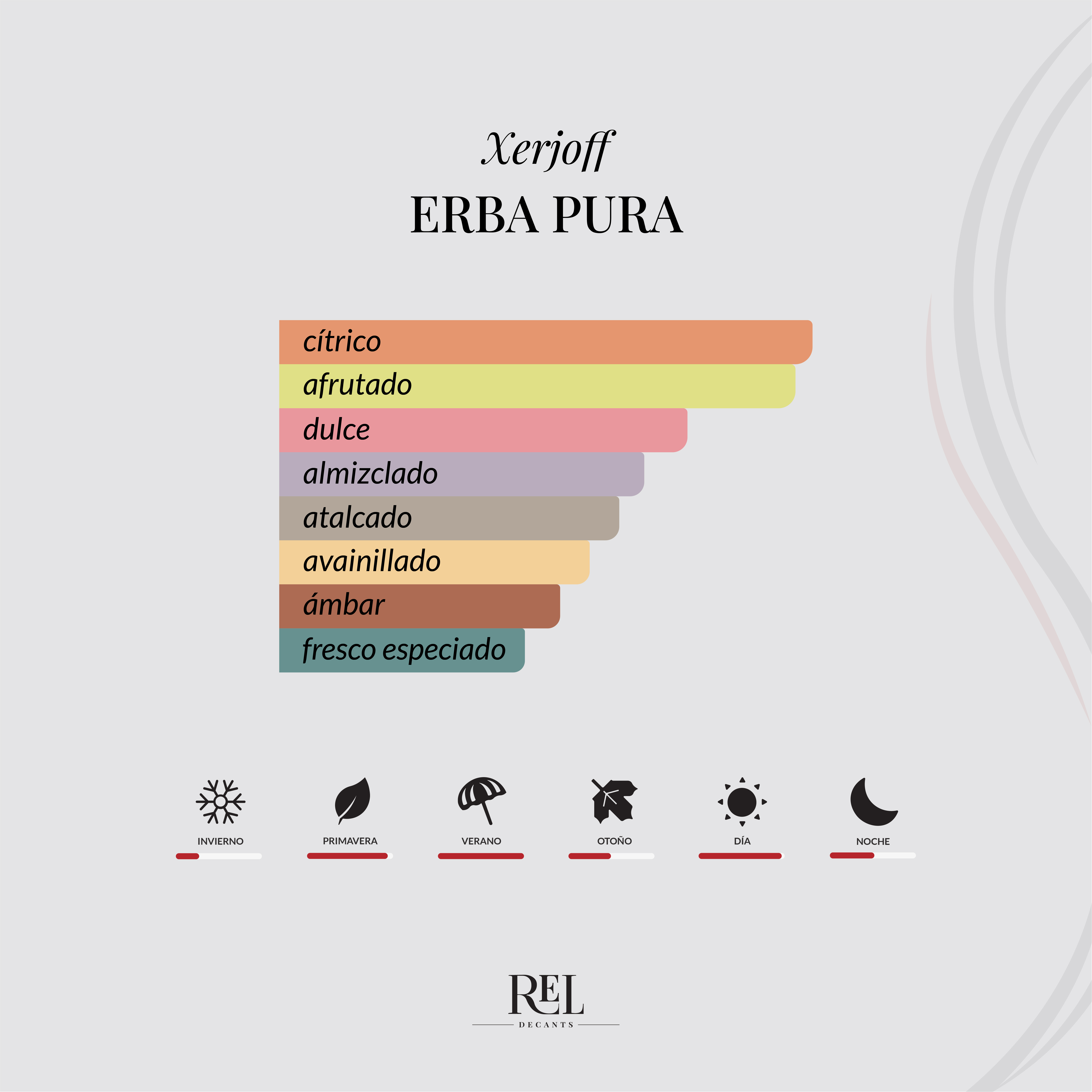 Erba Pura de Xerjoff es una fragancia frutal almizclada unisex, lanzada en 2019, que destaca por su perfil dulce, vibrante y extremadamente llamativo. Es un perfume con ADN moderno que mezcla frutas jugosas con un fondo cremoso y limpio, generando un aroma adictivo y muy reconocible.