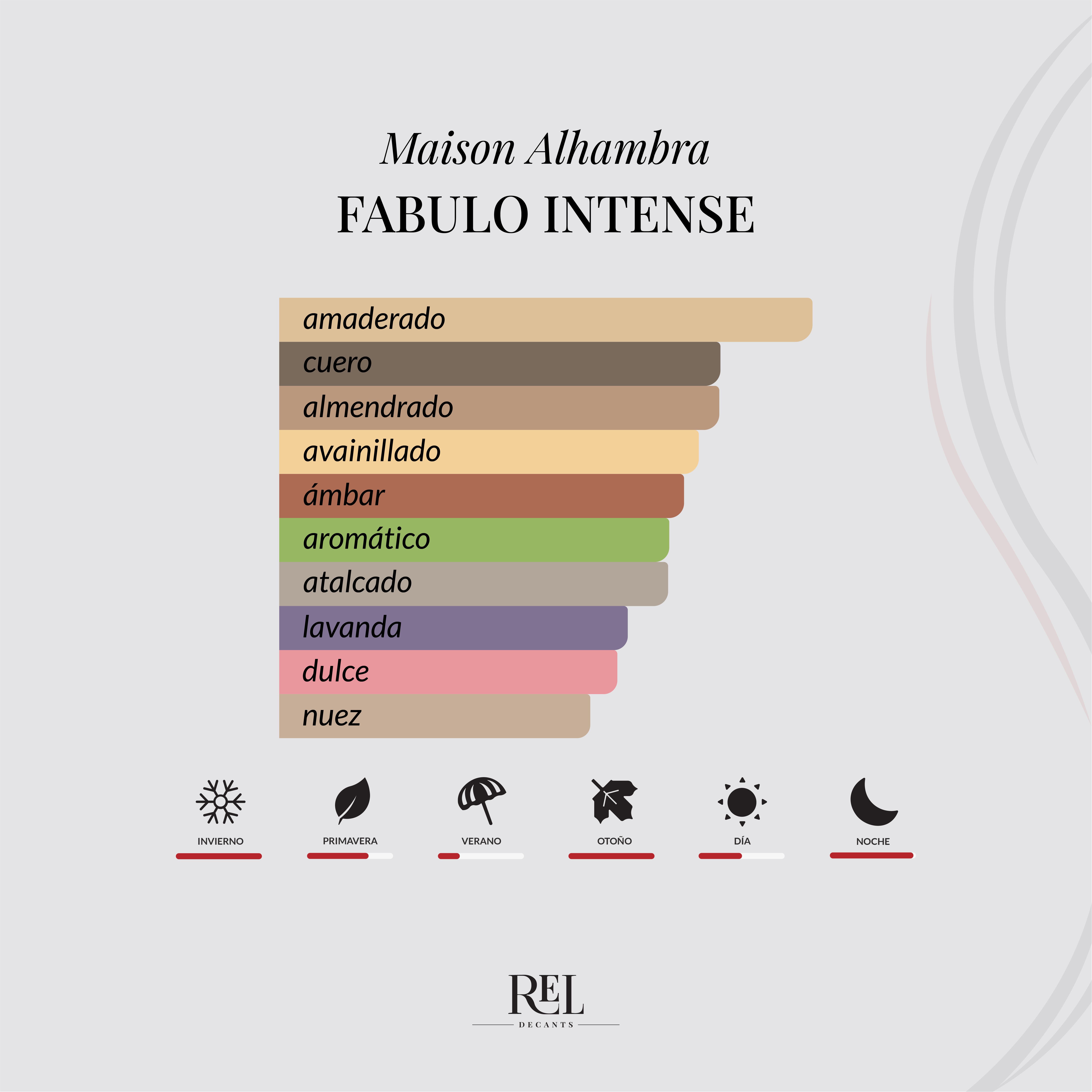 Fabulo Intense de Maison Alhambra es una fragancia oriental amaderada unisex, inspirada en el lujo de la perfumería de alta gama, que destaca por su perfil dulce, cremoso y especiado, con un toque cuero muy elegante. Es un perfume intenso, moderno y con mucha personalidad.
